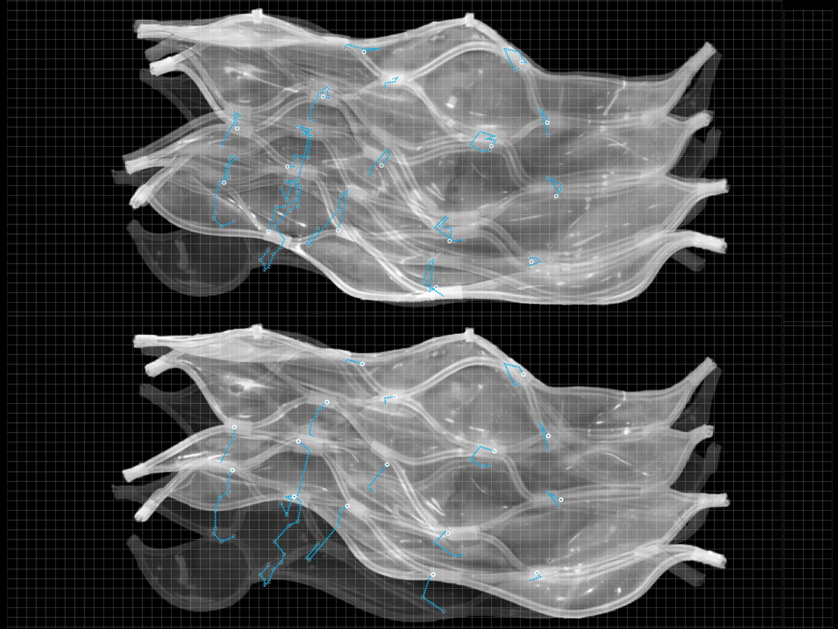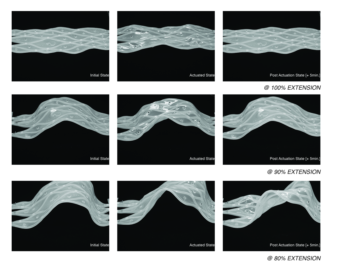 The SKiN project consists of small-scale prototypes of an adaptive kinetic surface capable of spatial modulation and responding to environmental stimuli. The Soft Kinetic Network (SKiN) surface is organized around the network (Soft Kinetic Grid) of embedded “muscle” wires that change shape under electric current. The network of wires, trained to take a sinusoidal shape, provides for a range of motions and facilitates surface transformations through soft and muscle-like movement. The material system developed around the wire network is variable and changes its thickness, stiffness, or permeability within its continuous composite structure. The variability in the material system enables it to (a) behave differently within surface regions; (b) vary the speed and degree of movement; (c) vary surface transparency; and (d) provide other levels of performance such as the capture of heat produced by the muscle wire and the distribution of heat within the surface regions.